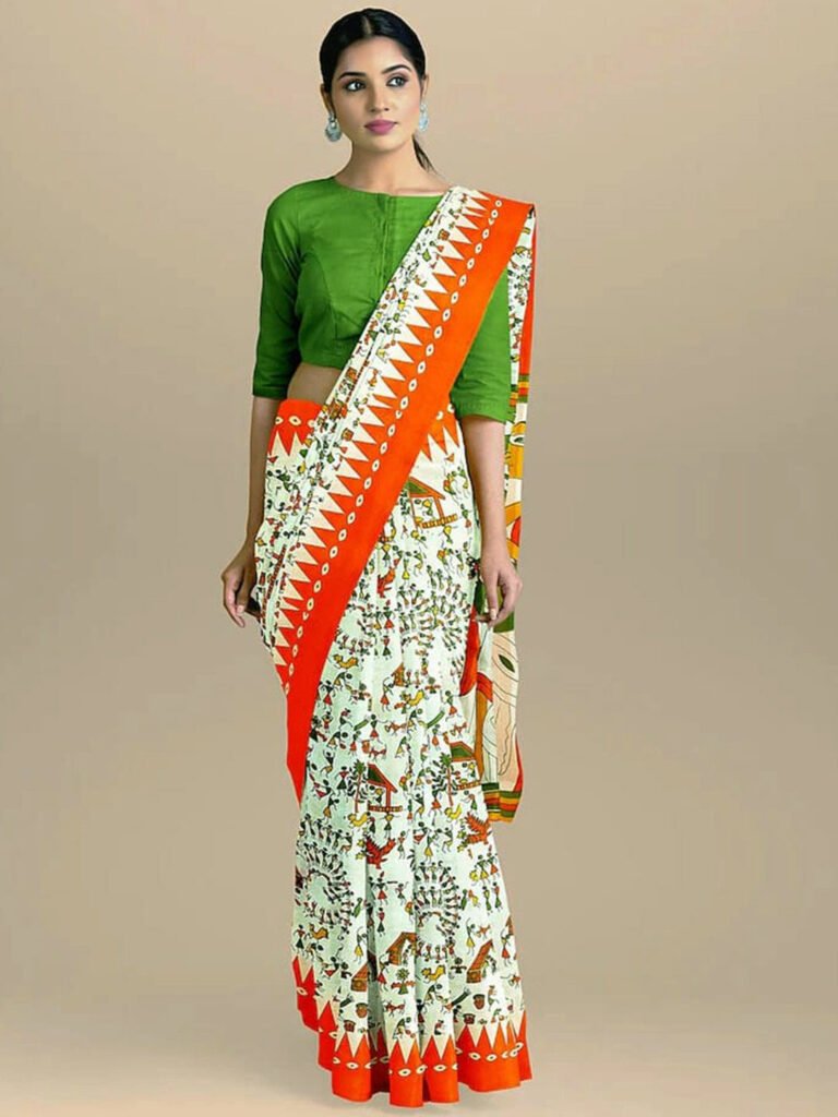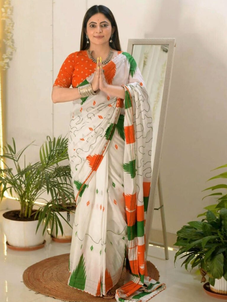 Accept this saree collection’s cotton printed tri-color saree pattern. You might go for an elbow-length, boat-neck blouse style and accessorize it with a simple, elegant ponytail. This understated yet elegant style is ideal for formal occasions and flag-raising ceremonies.